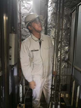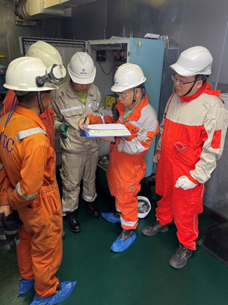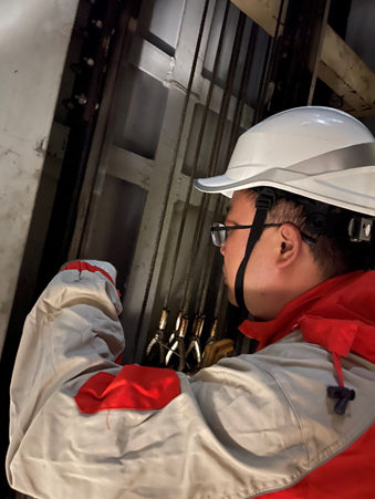 乘坐直升飛機順利抵達平臺后,檢驗小組與公司安全管理部、電氣部、機修部開會研究,確定下一步電梯檢驗方案及流程,技術交底及JSA(工作安全分析)。檢驗時檢驗人員嚴格按照國家標準,逐項開展檢驗檢測工作,分別對機房、轎廂、井道、底坑等方面進行了安全部件檢測及功能性試驗,并對潛在的安全隱患進行了識別與記錄。進入防爆區(qū)域后,嚴格按照作業(yè)平臺安全指示執(zhí)行,佩戴警示器穿戴全套防護裝備,對防爆叉車的防爆部件、行駛性能及制動性能等方面進行了檢查。
