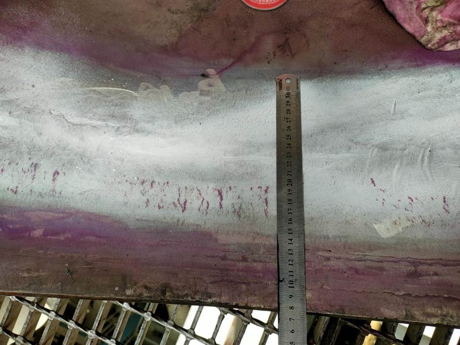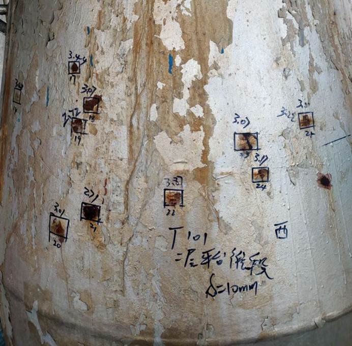 為保證企業(yè)順利開車,工程技術(shù)中心抽調(diào)精干力量,組織協(xié)調(diào)無損檢測(cè)、打磨輔助、腳手架搭設(shè)等多家單位,成立了40余人的項(xiàng)目組,并在停車前完成全部入廠手續(xù)的辦理。現(xiàn)場(chǎng)檢驗(yàn)時(shí),項(xiàng)目組人員嚴(yán)格按照院公司管理體系、作業(yè)指導(dǎo)標(biāo)準(zhǔn)開展檢驗(yàn)檢測(cè)工作,累計(jì)發(fā)現(xiàn)現(xiàn)場(chǎng)標(biāo)識(shí)錯(cuò)誤、銘牌缺失、地腳螺栓缺失、腐蝕減薄、焊接接頭開裂、氫鼓包等各類問題40余項(xiàng)。