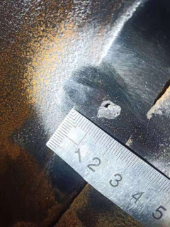 近日,國(guó)投省院容器分公司接到濰坊某煉化企業(yè)的報(bào)檢申請(qǐng),對(duì)其氣分裝置壓力容器、壓力管道進(jìn)行定期檢驗(yàn),檢驗(yàn)人員在對(duì)脫碳五塔回流罐焊縫進(jìn)行磁粉檢測(cè)時(shí),發(fā)現(xiàn)一處缺陷,宏觀看僅有針孔大小,焊縫經(jīng)打磨至母材齊平后,發(fā)現(xiàn)是制造缺陷-密集氣孔,經(jīng)具有相關(guān)資質(zhì)單位維修人員打磨后,最深處達(dá)到7mm。